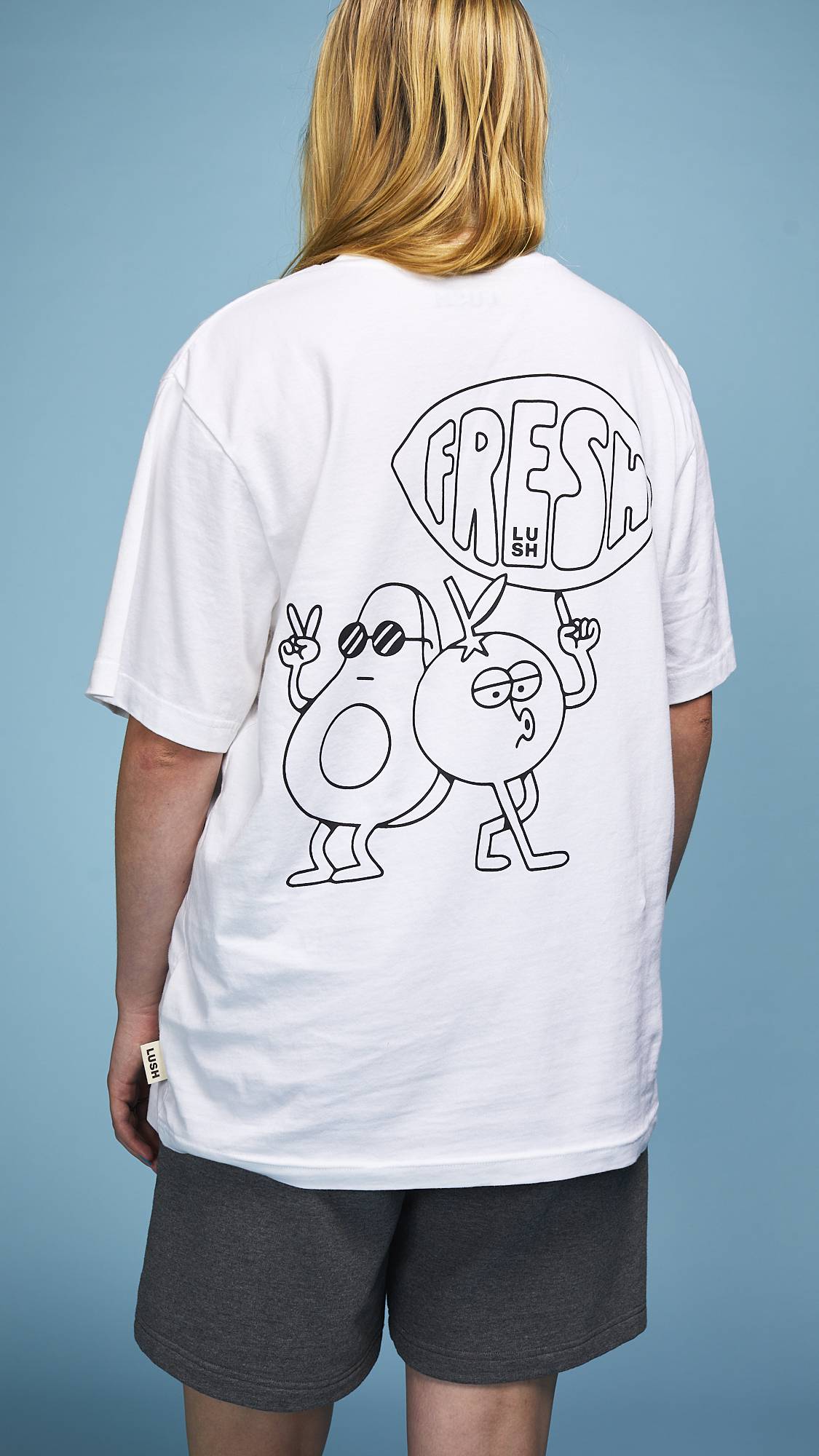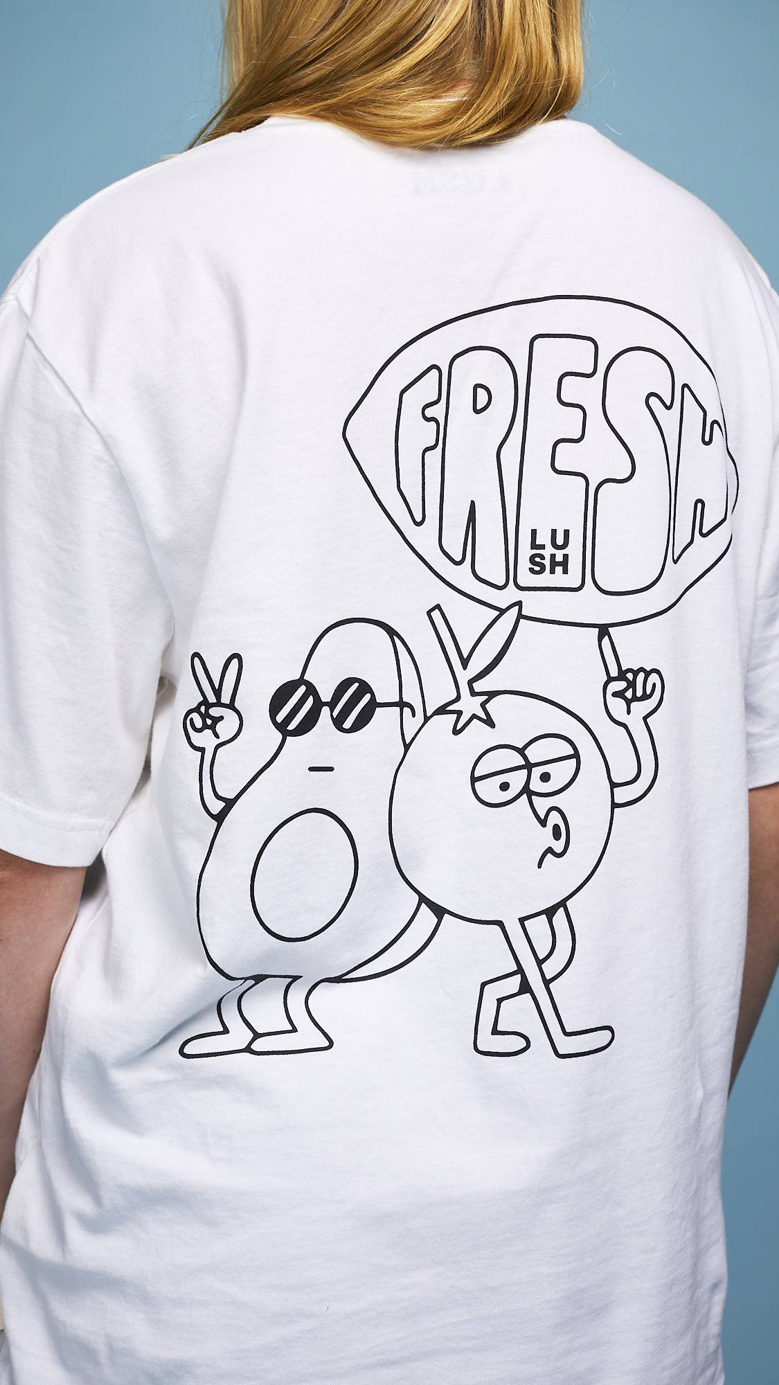 Fresh ingredients are intrinsic to Lush. Join us in a colorful celebration of this core Lush value at the heart of our philosophy while you keep it classic with this versatile black and white, 100% organic cotton tee. The print was designed in collaboration with an artist local to the U.K., Dorset and features a small front pocket print and a larger print on the back.