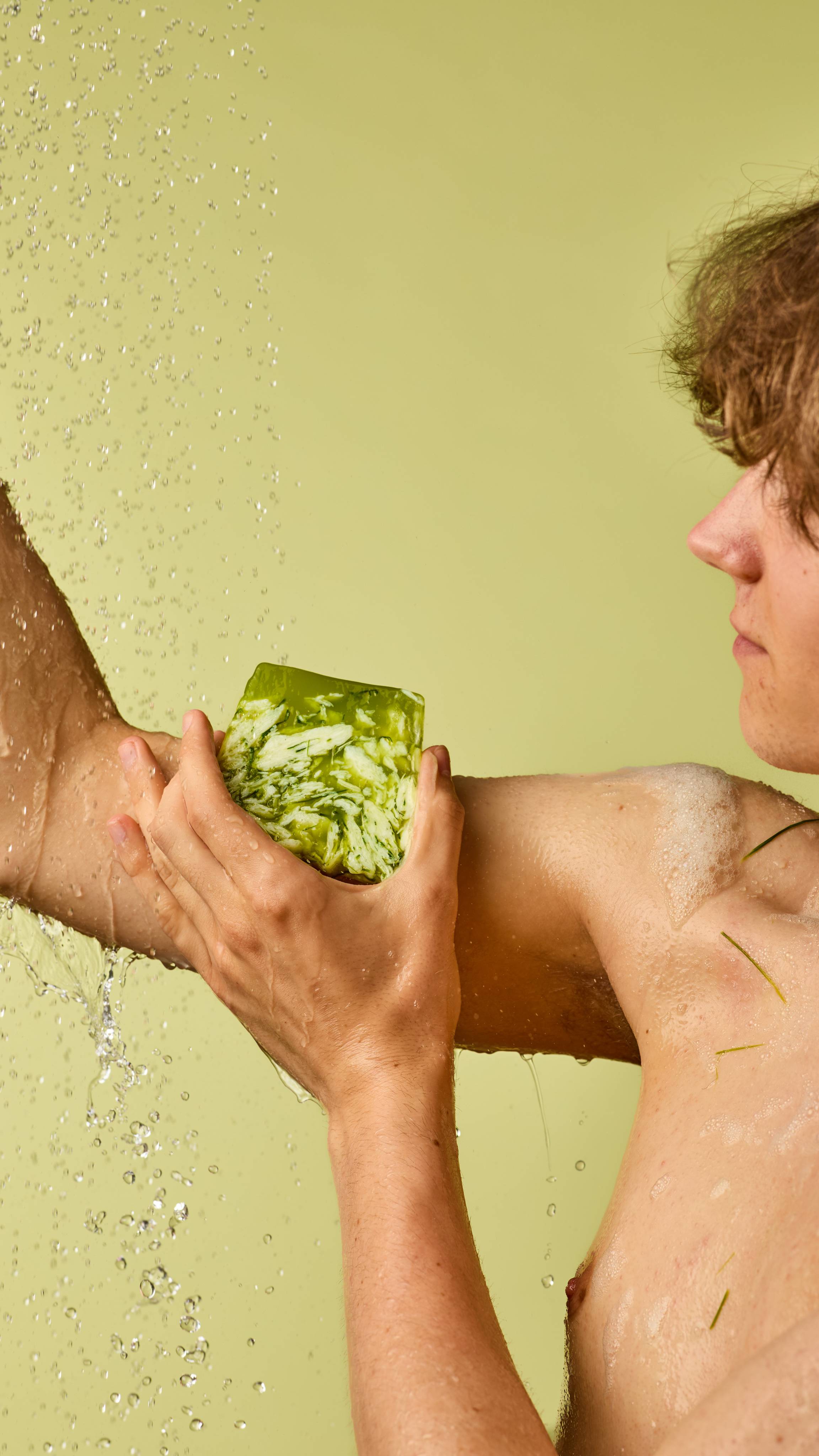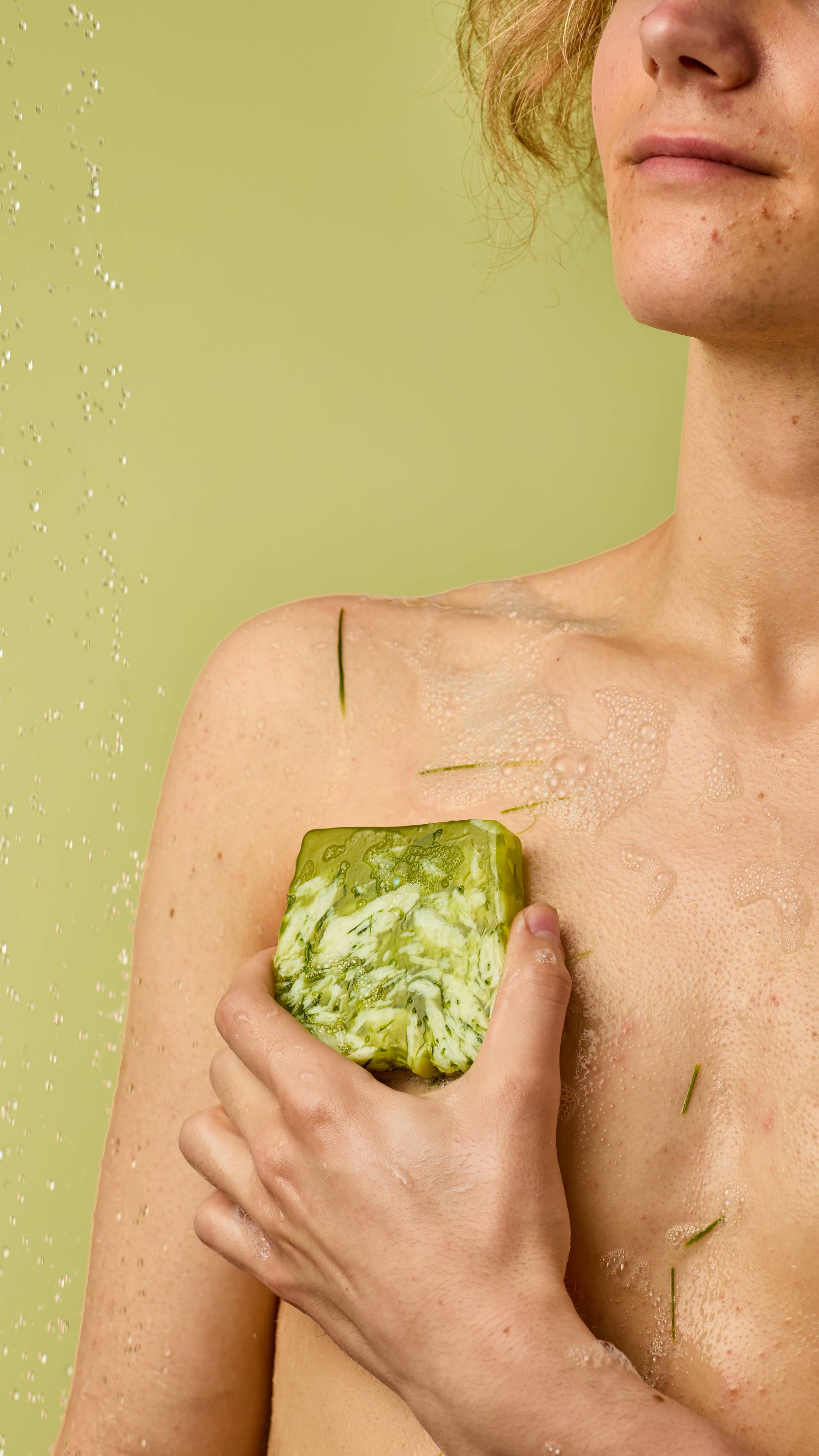 With lemongrass and wheatgrass — perfect for washing your feet after grounding on the grass, or the whole body for a fragrant, mood-boosting cleanse